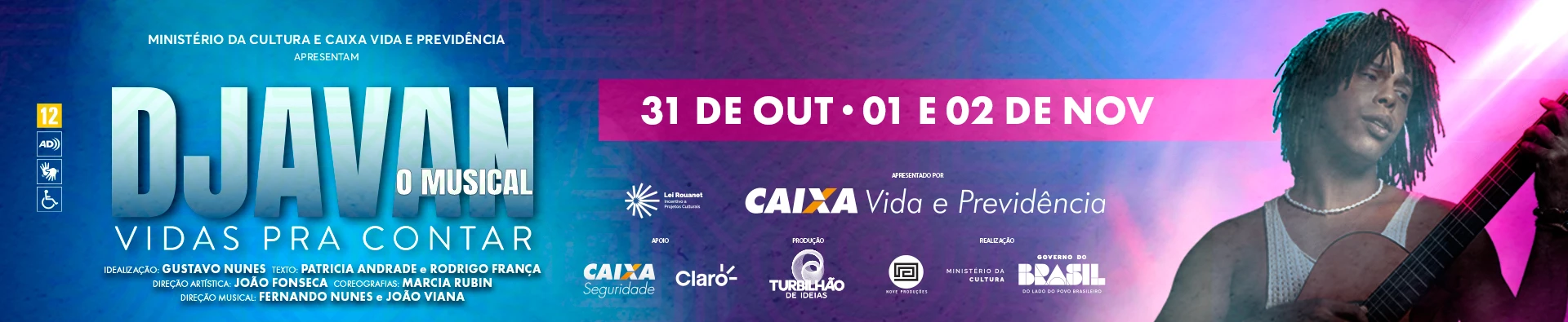 “Djavan - O Musical: Vidas pra contar”, espetáculo que homenageia a trajeto ria e a obra do cantor e compositor alagoano. Idealizado por Gustavo Nunes, com direção artística de João Fonseca e texto de Patrícia Andrade e Rodrigo França, o projeto narra a caminhada de um dos artistas mais importantes da música brasileira.