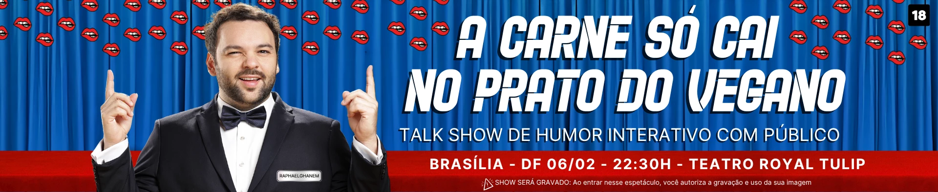 Com texto, interpretação e direção de Raphael Ghanem, " A carne só cai no prato do Vegano" é um espetáculo de Talkshow com a plateia, o público vira protagonista e participa de 90% do show com jogos de entrevista e interações ao vivo.