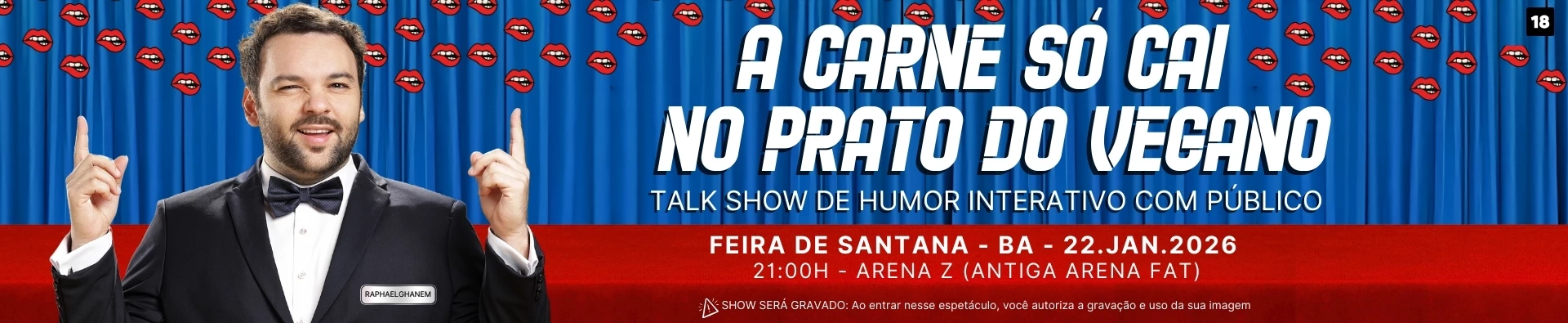 Com texto, interpretação e direção de Raphael Ghanem, " A carne só cai no prato do Vegano" é um espetáculo de Talkshow com a plateia, o público vira protagonista e participa de 90% do show com jogos de entrevista e interações ao vivo.