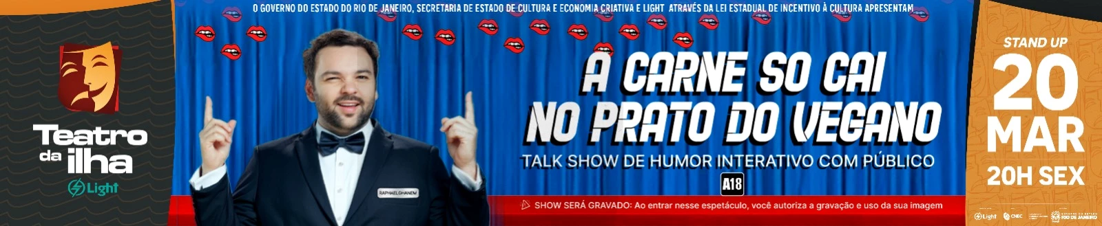 Com texto, interpretação e direção de Raphael Ghanem, " A carne só cai no prato do Vegano" é um espetáculo de Talkshow com a plateia, o público vira protagonista e participa de 90% do show com jogos de entrevista e interações ao vivo.