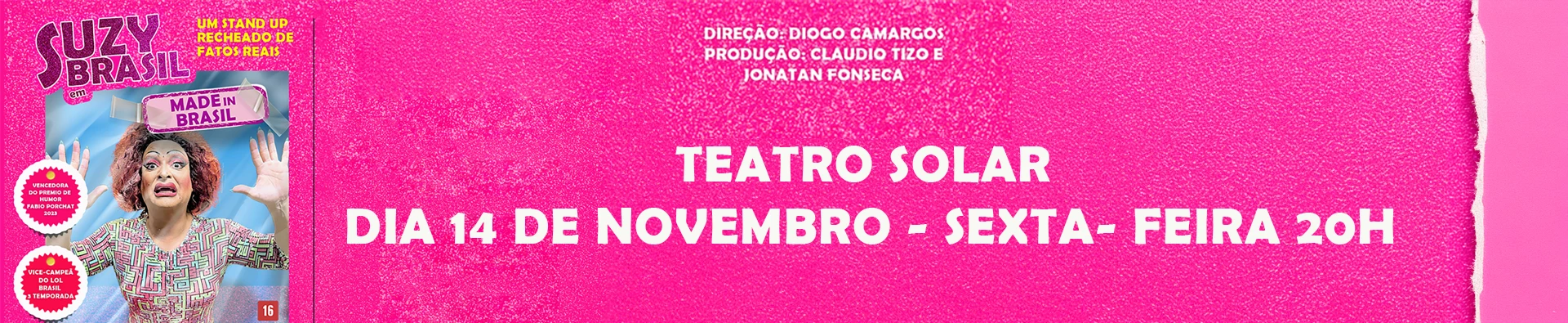 VENCEDORA do PRÊMIO PRIO DO HUMOR 2023, criado por Fábio Porchat, pelo espetáculo Bye Bye Bangú e VICE CAMPEÃ da terceira temporada do LOL BRASIL – SE RIR, JÁ ERA! do Amazon Prime, SUZY BRASIL estreia seu novo stand up comedy MADE IN BRASIL, onde ela relembra divertidas histórias dos seus mais de 25 anos de vida artística e mais de 40 anos de vida do seu criador Marcelo Souza.