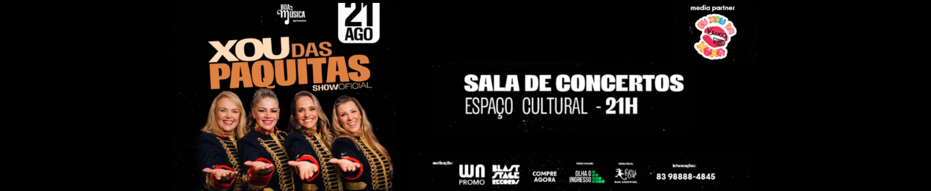 O espetáculo “Xou das Paquitas” desembarca em João Pessoa no próximo dia 21 de agosto às 21h, levando ao palco da Sala de Concertos do Espaço Cultural uma noite marcada por nostalgia, música e memórias afetivas dos anos 1980 e 1990. Os ingressos já estão à venda, com valores a partir de R$ 100,00 (meia-entrada), na loja Furta Cor, no Mag Shopping, e online pelo site Olha o Ingresso.