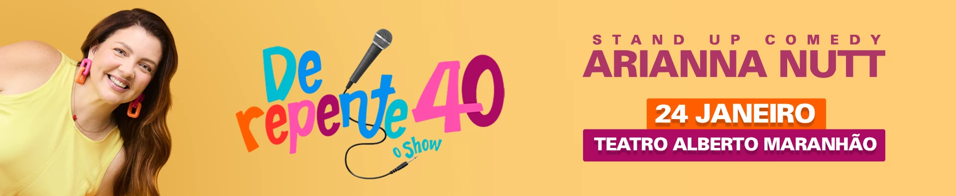 "De Repente 40". Nesse show, Arianna aborda de forma hilária as mudanças da vida aos 40 anos, compartilhando suas experiências pessoais e levando o público a se identificar e rir das situações do cotidiano.