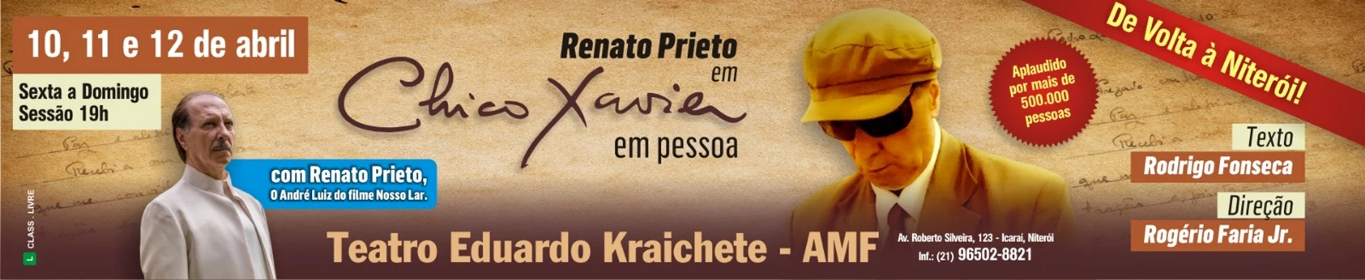 O espetáculo é estrelado por Renato Prieto, que interpretou o personagem André Luiz no filme Nosso Lar, sucesso absoluto de público no cinema brasileiro. No palco, Renato entrega uma atuação intensa, sensível e espiritualizada, que emociona e transforma plateias por onde passa.