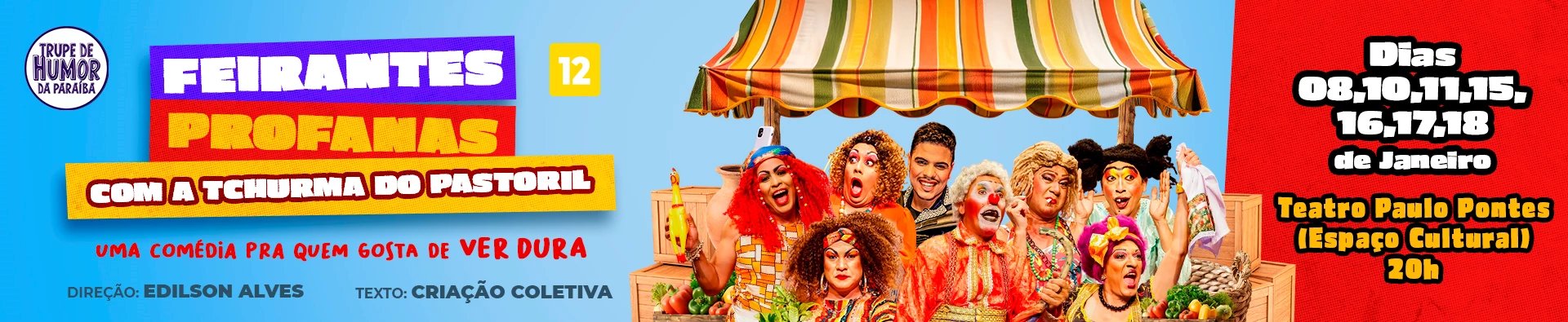 “Feirantes Profanas” com a turma do Pastoril, realizado pela Trupe de Humor da Paraíba” é uma comédia nordestina irreverente que transforma o cotidiano popular e o clima do ano eleitoral em matéria-prima para o riso. Com inteligência, exagero e muito deboche, o espetáculo satiriza situações corriqueiras do povo, misturando política, costumes e conflitos sociais em cenas carregadas de humor crítico e identificação imediata com o público.