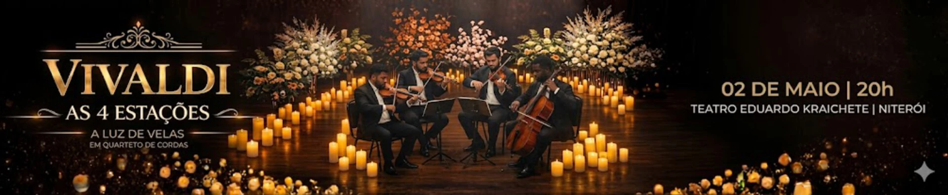 As Quatro Estações, de Antonio Vivaldi, ganham uma interpretação especial em um espetáculo apresentado por um refinado quarteto de cordas, em uma atmosfera intimista e iluminada à luz de velas.