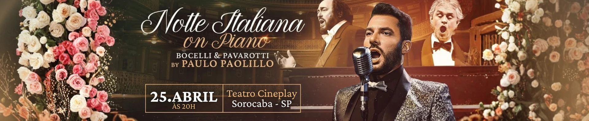 Conheça NOTTE ITALIANA, uma viagem a Itália, mas sem ser de avião, mas uma viagem pela emoção, embarcando em um universo inigualável - inspirado nas vozes inigualáveis de Luciano Pavarotti e Andrea Bocelli, o show conta com interpretações de clássicos como Nessun Dorma, O Sole Mio, Caruso e Con te Partirò, entre outras preciosidades da música lírica italiana.Neste tributo repleto de sensibilidade, destaca-se o virtuoso tenor Paulo Paolillo. Nascido em São Paulo, iniciou seus estudos com Benito Maresca, formou-se na Universidade de Música Carlos Gomes e ampliou sua formação internacionalmente, passando pela Mirella Freni Singing Academy, o Teatro Comunale di Bologna e festivais como o Wexford Festival Opera e o Macerata Opera Festival. Já solista em palcos como a Hamburg State Opera e o Teatro Kassel, estreou “Elisir d’Amore” como protagonista no Teatro Varna, na Bulgária, e participou de importantes eventos orquestrais, incluindo um Réquiem de Mozart em Beirute. Sua carreira é coroada com reconhecimento em concursos internacionais, como o Marcello Giordani, Belvedere Singing Competition, Crescendi e Montecatini Correio do Estado Com seu timbre lírico e expressividade única, Paulo Paolillo encarna de forma sublime a alma da ópera, arrebatando corações e transportando os espectadores diretamente às ruelas iluminadas da Itália.