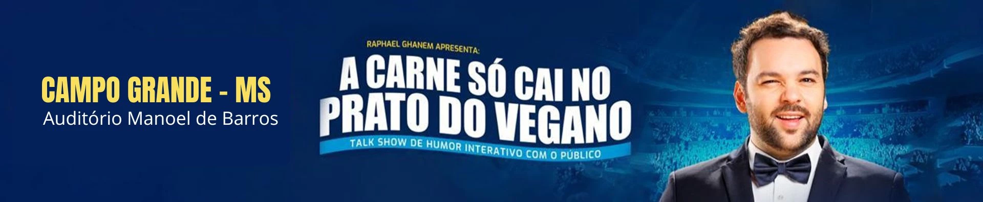 Com texto, interpretação e direção de Raphael Ghanem, " A carne só cai no prato do Vegano" é um espetáculo de Talkshow com a plateia, o público vira protagonista e participa de 90% do show com jogos de entrevista e interações ao vivo.