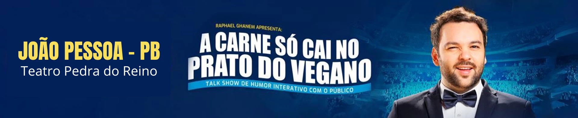 Com texto, interpretação e direção de Raphael Ghanem, " A carne só cai no prato do Vegano" é um espetáculo de Talkshow com a plateia, o público vira protagonista e participa de 90% do show com jogos de entrevista e interações ao vivo.