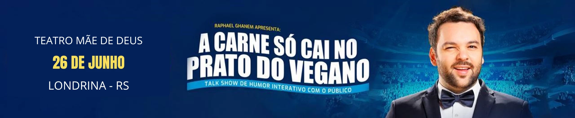 Com texto, interpretação e direção de Raphael Ghanem, " A carne só cai no prato do Vegano" é um espetáculo de Talkshow com a plateia, o público vira protagonista e participa de 90% do show com jogos de entrevista e interações ao vivo.