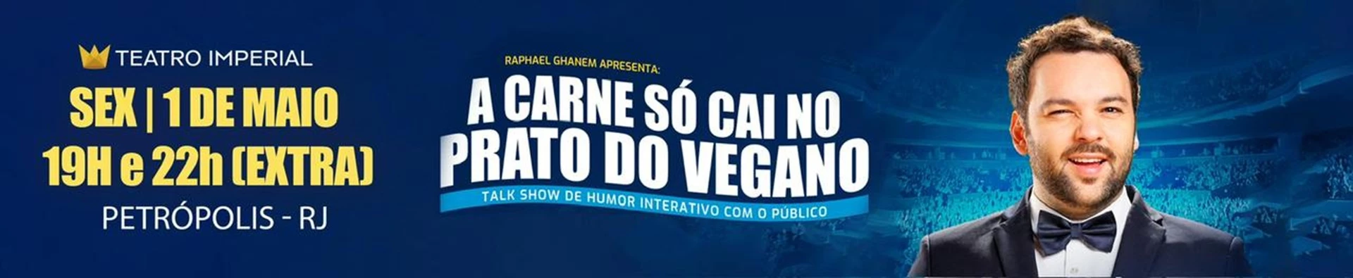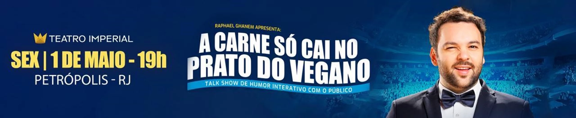 Com texto, interpretação e direção de Raphael Ghanem, " A carne só cai no prato do Vegano" é um espetáculo de Talkshow com a plateia, o público vira protagonista e participa de 90% do show com jogos de entrevista e interações ao vivo.