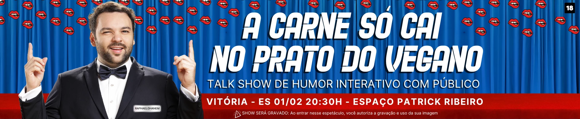 Com texto, interpretação e direção de Raphael Ghanem, " A carne só cai no prato do Vegano" é um espetáculo de Talkshow com a plateia, o público vira protagonista e participa de 90% do show com jogos de entrevista e interações ao vivo.